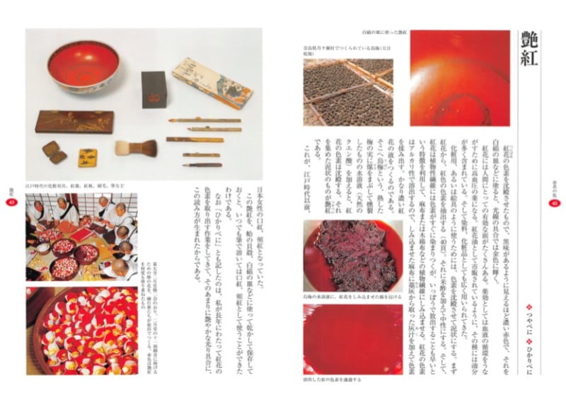 化粧用、あるいは絵具のように使うためには、色素を沈殿させて泥状にする。まず紅花から、紅色の色素を抽出する。それに米酢を加えて中性にする。そして、紅花は植物性繊維には色素がすぐに染まりつくが、いっぽうで放出することも早いという特徴を利用して、麻布または木綿布などの植物繊維にしみ込ませる。紅花の色素はアルカリ性で溶出するので、しみ込ませた麻布に藁灰から取った灰汁を加えて色素を揉み出す。かなり濃い紅花の液をつくるのである。そこへ