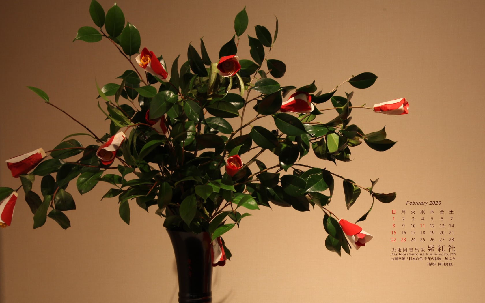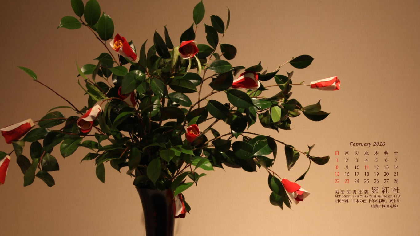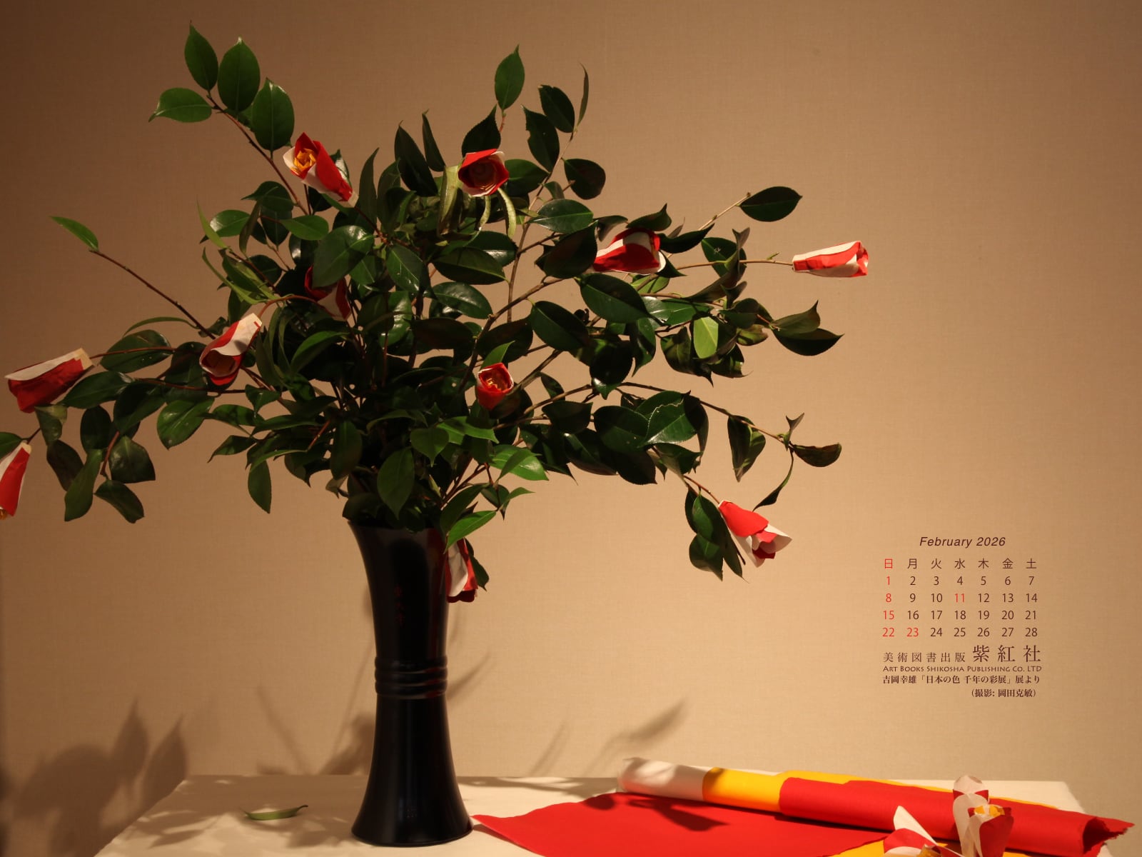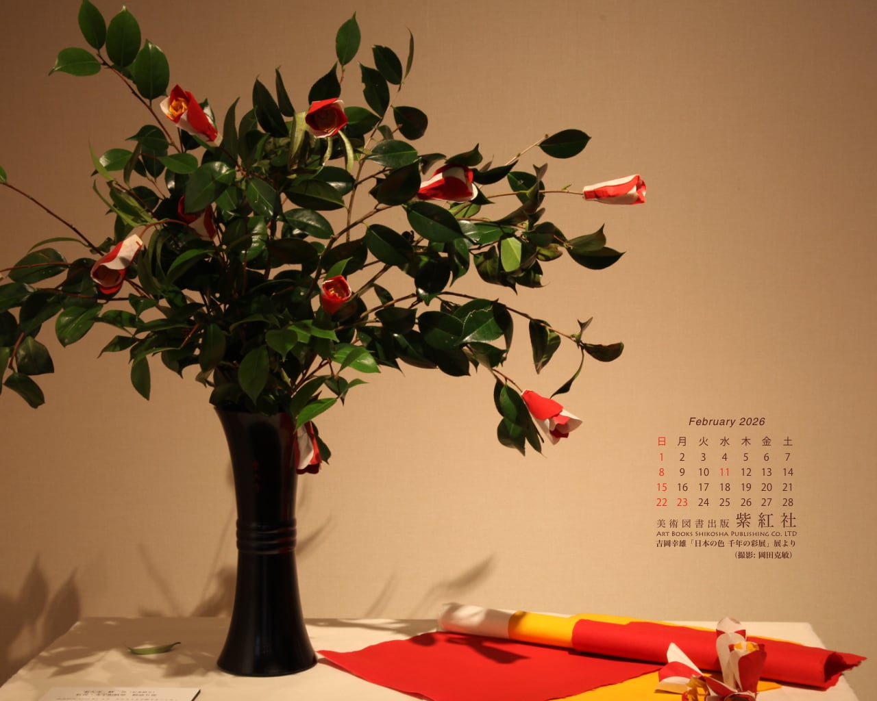 菊池寛賞受賞記念 吉岡幸雄「日本の色 千年の彩展」 (撮影: 岡田克敏) より、染司よしおか植物染作品の東大寺修二会 (お水取り) 椿の造り花を壁紙にしました。