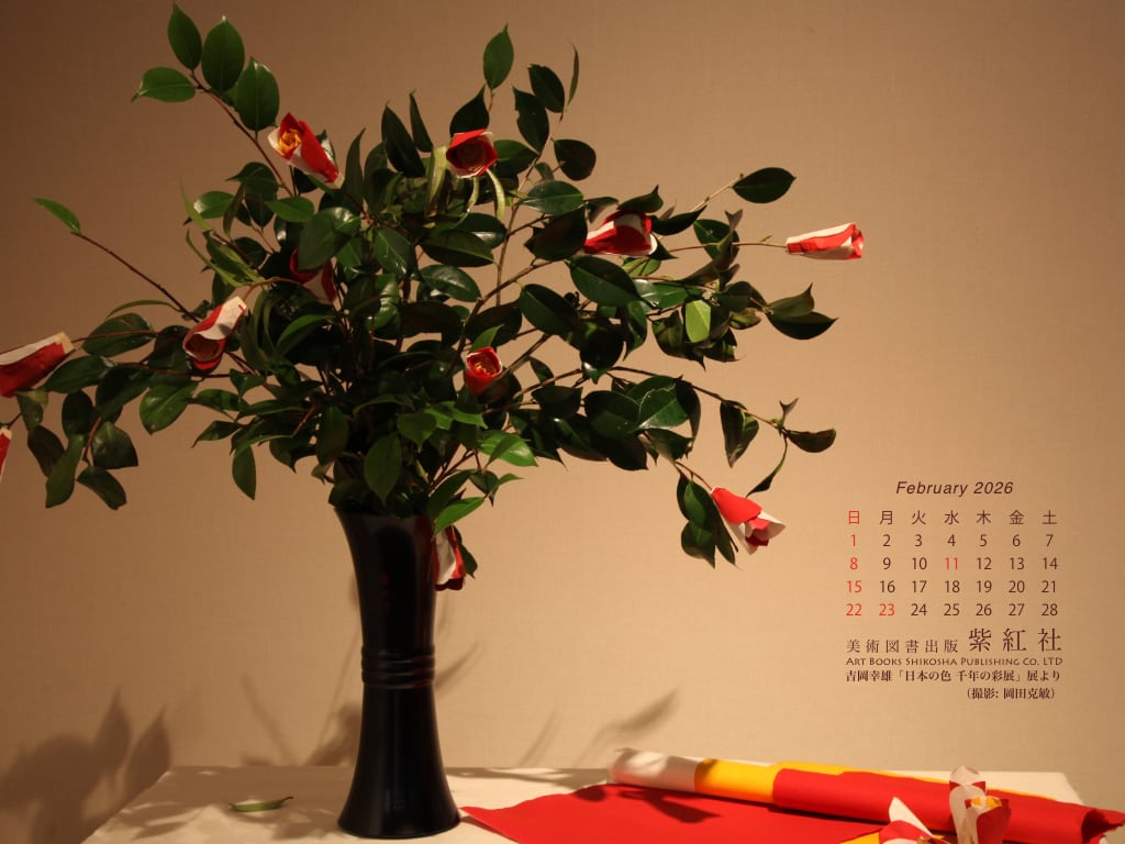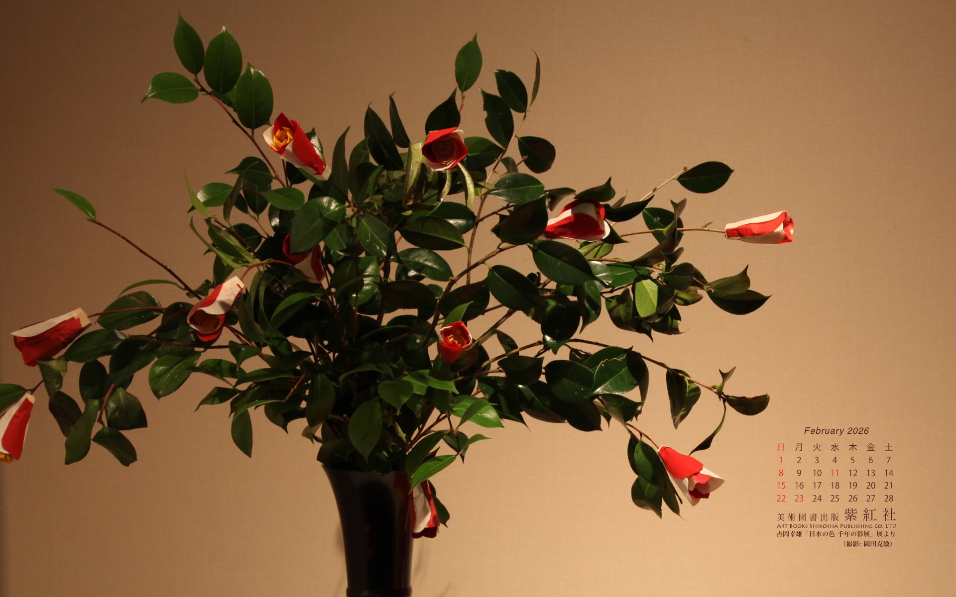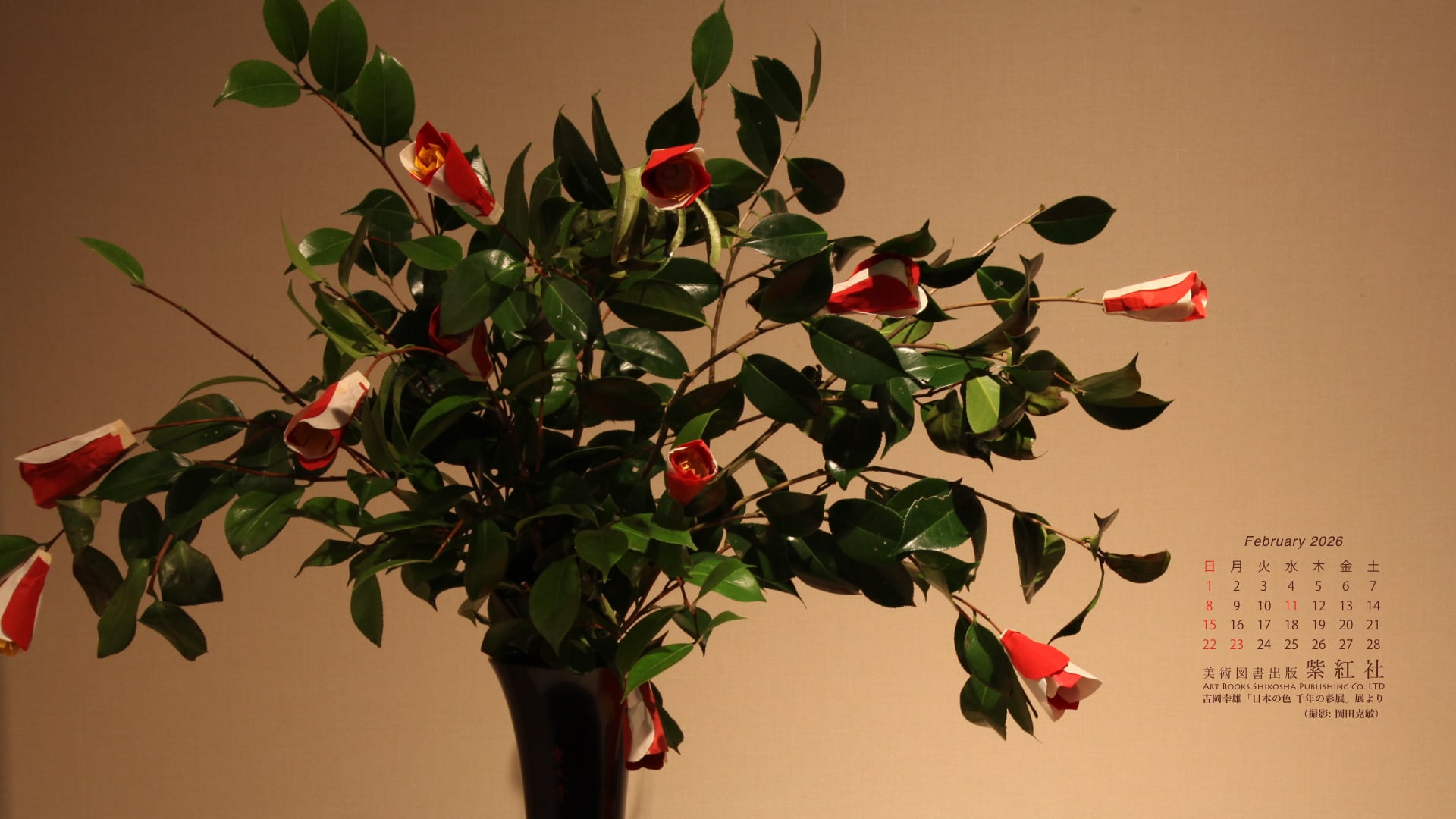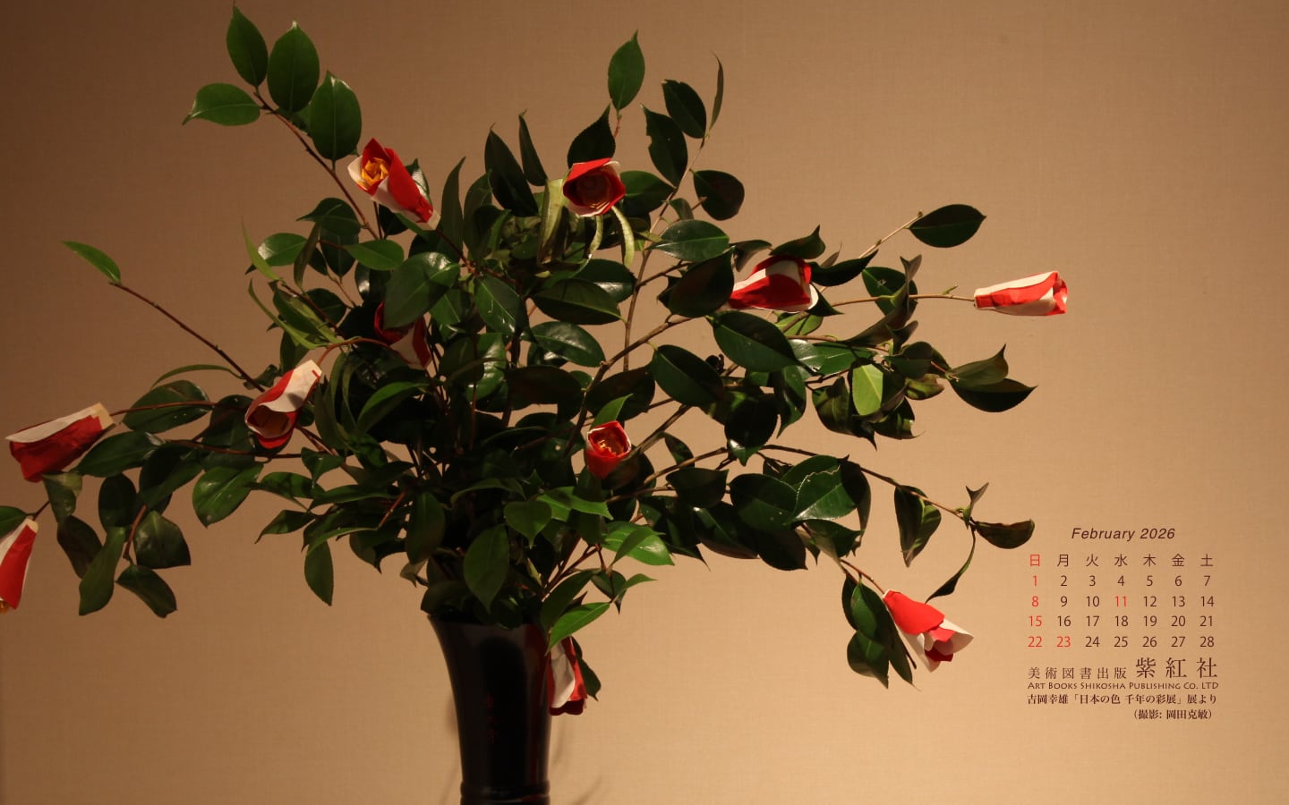 菊池寛賞受賞記念 吉岡幸雄「日本の色 千年の彩展」 (撮影: 岡田克敏) より、染司よしおか植物染作品の東大寺修二会 (お水取り) 椿の造り花を壁紙にしました。