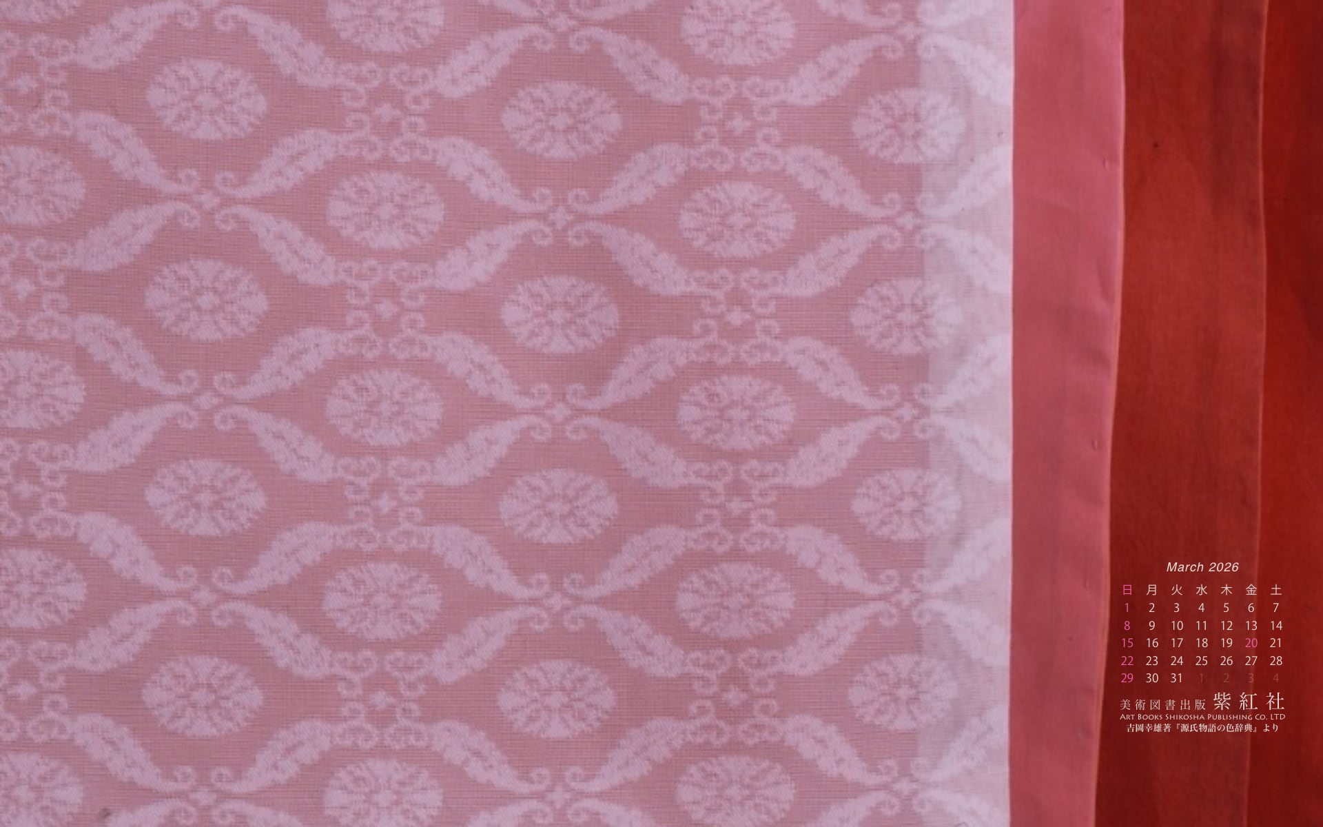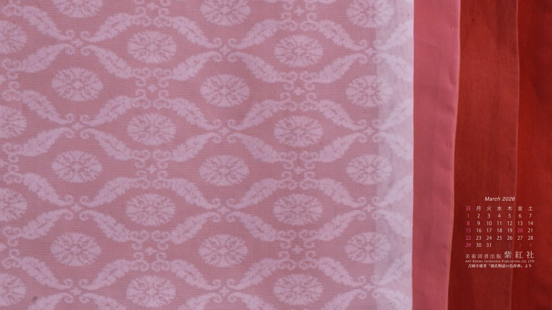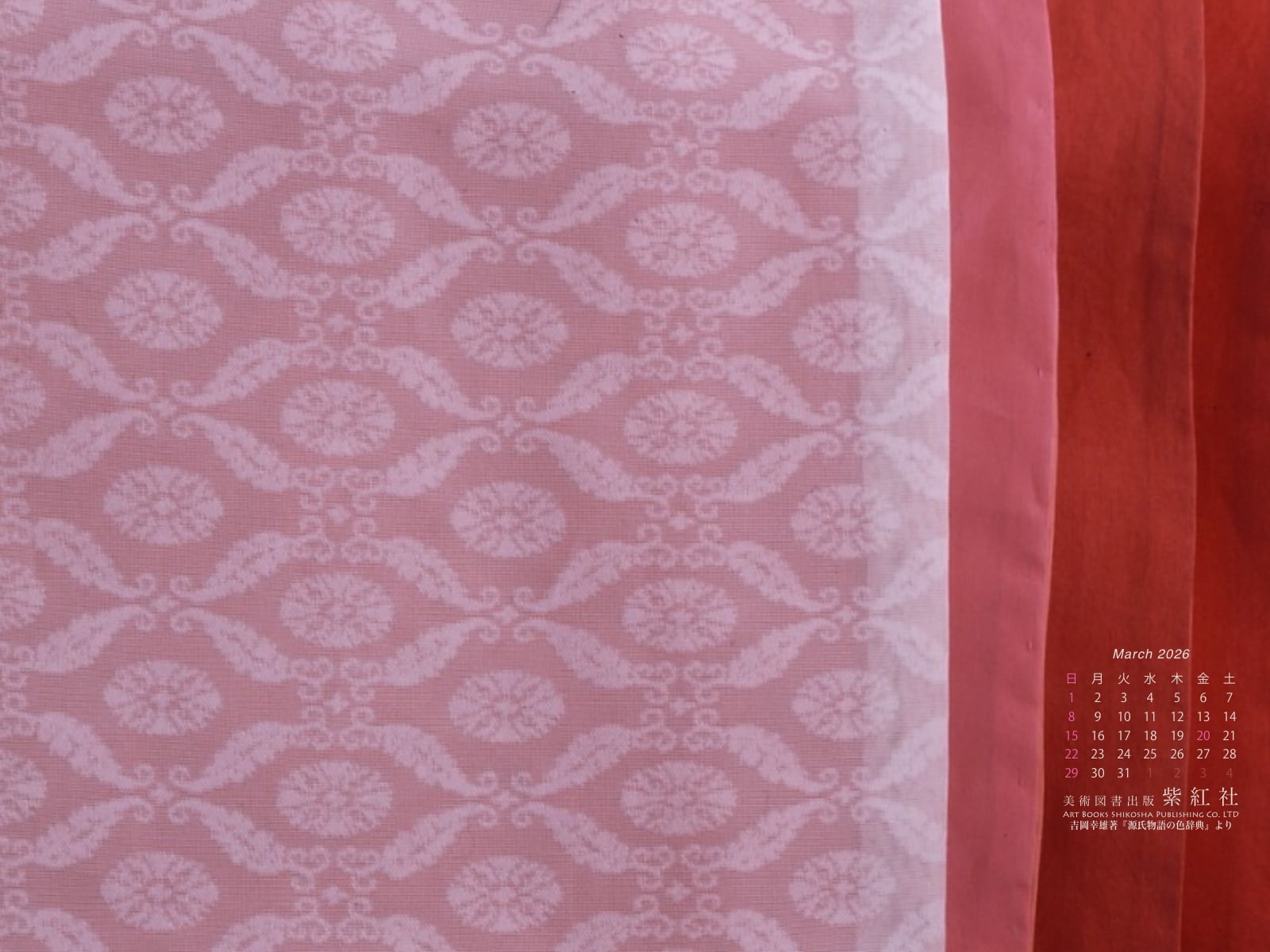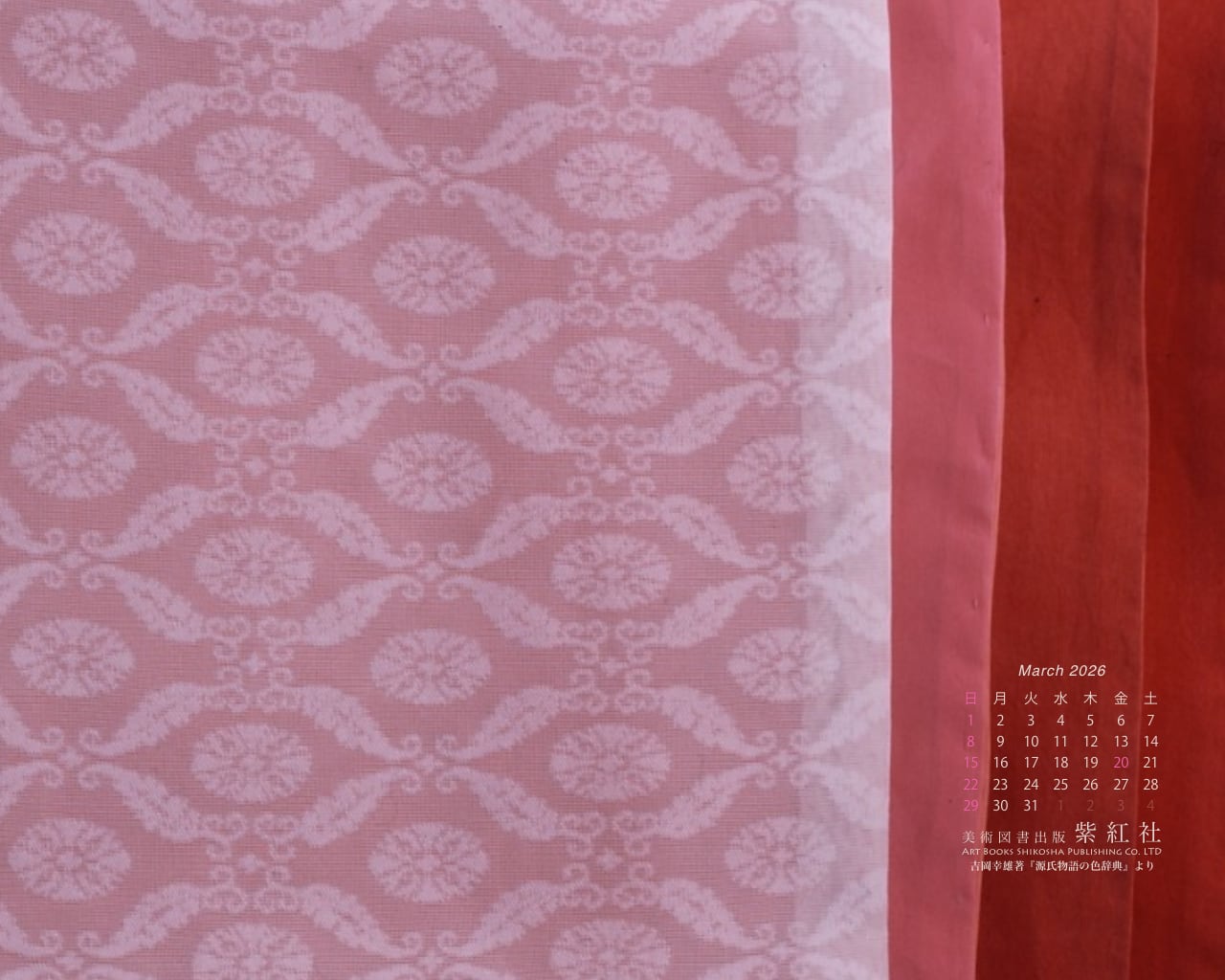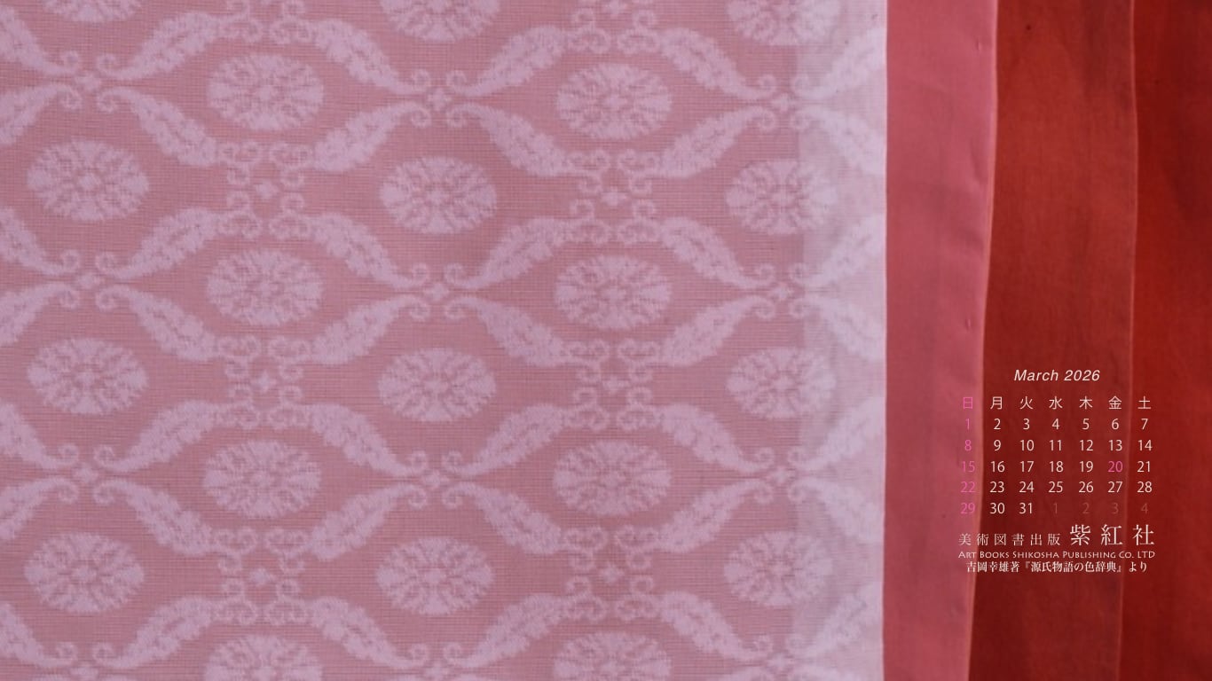 『源氏物語の色辞典』「若菜上」より「桜の細長」をデスクトップ壁紙にしました(染色:染司よしおか)。