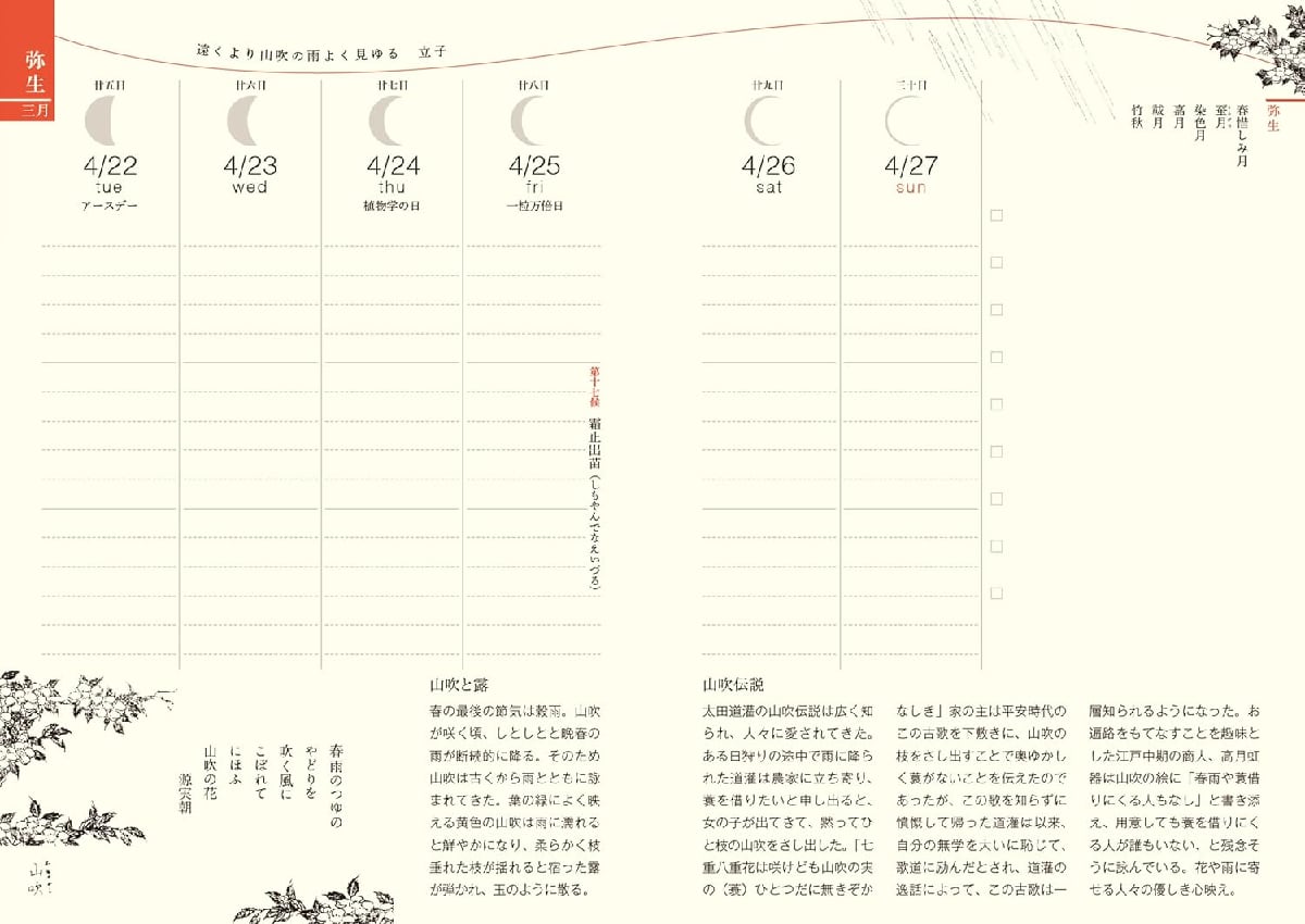 グレゴリオ暦とは異なる時間軸を感じていただくために、和暦元旦から始まる日付になっています。スケジュールに追われる日常とは別の時間軸にシフトする感覚で、お使いください。