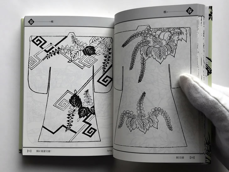 主に江戸時代に刊行された小袖や器物などの文様集『雛形本』から選んだ意匠文様約400図を「春」「夏」「秋」「冬」「四季」「吉祥・文字・器物」「扇絵・団扇絵」に大別した上、「桜」「藤」などの項目ごとに分類、掲載して、絵引き図典としての用を目指したもの。各文様は線書きを主体として構成することで、実用書としての利便性をはかった。